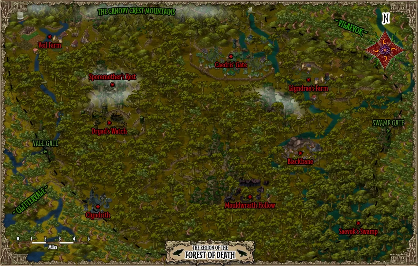 A terrible place, spoken of in whispers and with a watchful look out the corner of the eye, the Forest of Death is a den of degenerates where those not wanted are sent, where the worst of worst have made their home. Death comes not just from those sentenced to eternity in this place, but from the many plants and predators hiding in the deep shadows, from the very air itself.