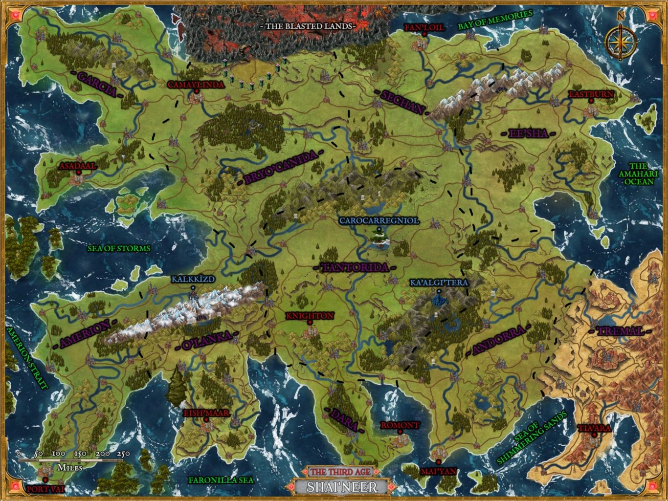 Shai'neer is one of the larger continents on Yanavaria - a world that is roughly 60% ocean, 40% land. It sits below the equator and is mostly a temperate climate.